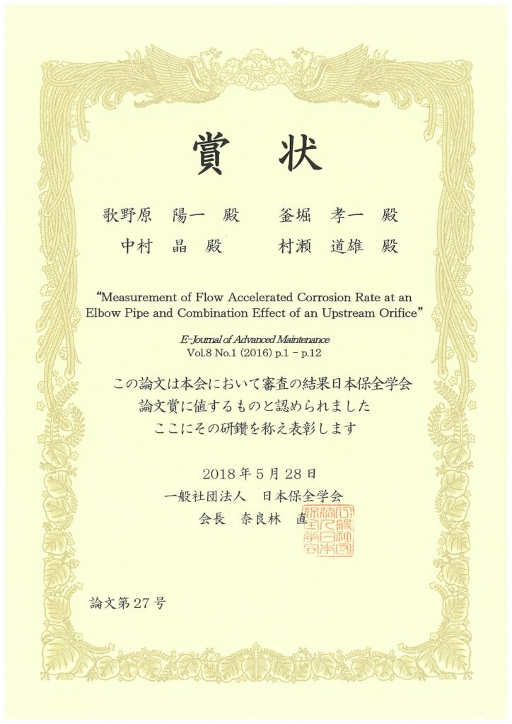 2018年5月、日本保全学会において「平成29年度 論文賞」を受賞しました。