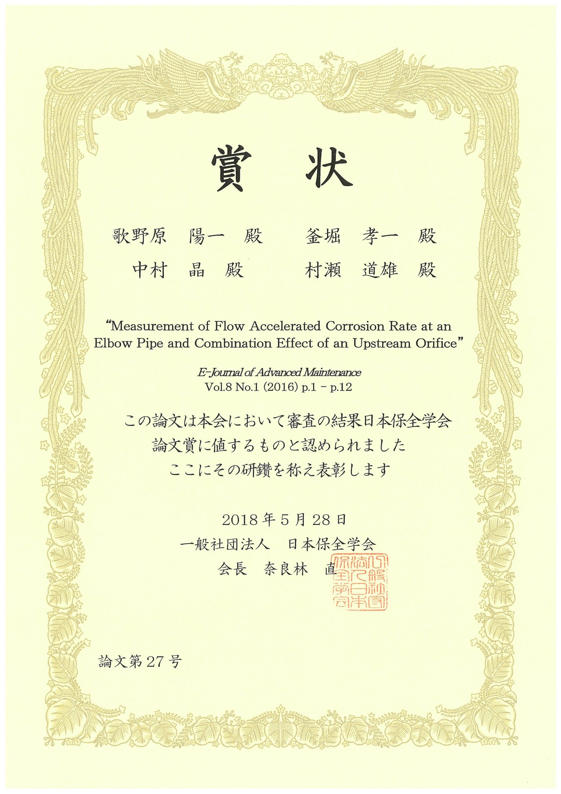 2018年5月、日本保全学会において「平成29年度 論文賞」を受賞しました。