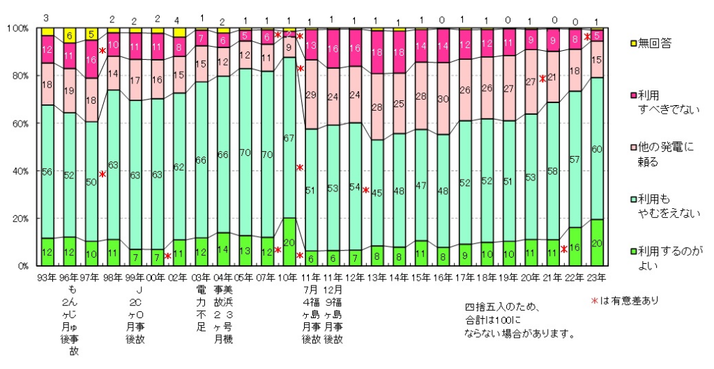 1993年以降、継続的に原子力発電に対する世論調査を実施。東京電力福島第一原子力発電所以降の変化も踏まえ、賛否にとどまらず、その背後にある認識の変化もとらえています。